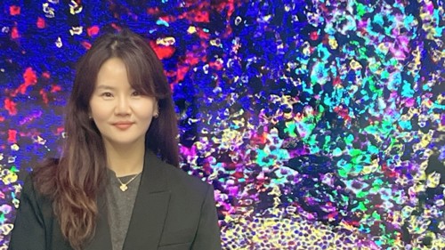 Dr Saem Park with an image of the tumour microenvironment of melanoma-infiltrated lymph node tissue, visualised by multiplex immunofluorescence using the Vectra Polaris imaging system.