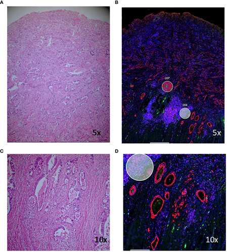 Haematoxylin and eosin (H+E) and morphology-marker stained sections for digital spatial analysis. Staining of a representative section of colitis-associated colorectal cancer (A, C) and corresponding morphology marker-stained sections (B, D). Red, PanCK; green, CD3; magenta, CD45; blue, nuclear stain; circles, regions of interest chosen for subsequent gene-expression analysis. Source: Front. Oncol. 14:1247106. doi: 10.3389/fonc.2024.1247106 © 2024 Glyn, Williams, Whitehead, Eglinton, West and Purcell.